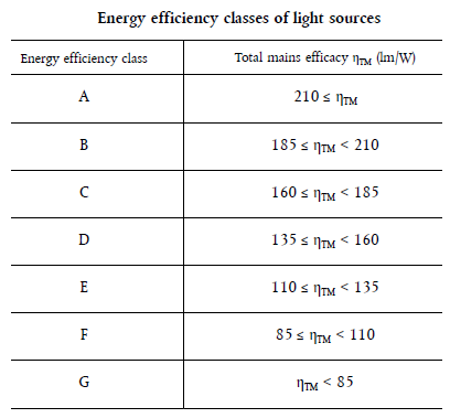 灯具的能源标签上面显示了各种适合在灯具中使用的灯泡能效等级。 从2019年12月25日起,不再需要对灯具贴标签。